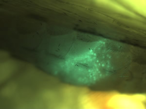 (写真:ハマダラカ腹部のマラリア原虫オーシスト(緑色))